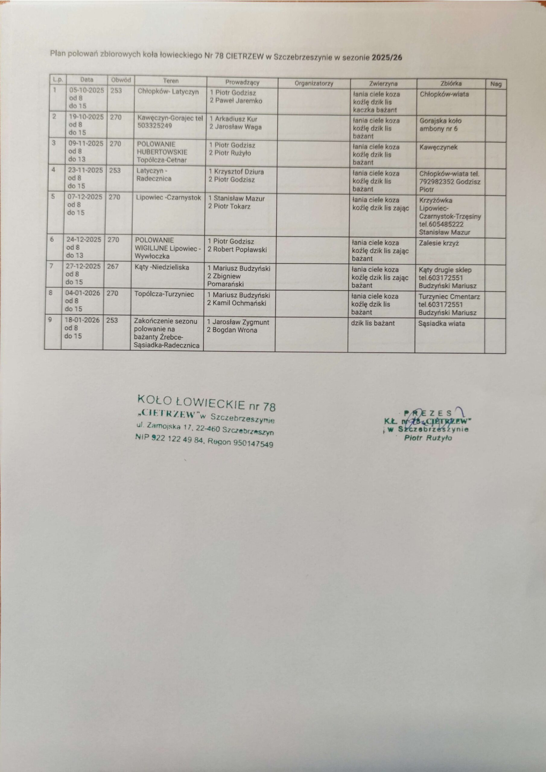 Plan polowań zbiorowych koła łowieckiego Nr 78 Cietrzew w SzczebrzeszynieRedakcja2025-10-23Aktualności Drukuj🖨 Poprzedni Wpis WYMIANA OSŁON WAŁKA PRZEKAŹNIKA MOCY Następny Wpis Informacja o dofinansowaniu w ramach Programu Ochrony Ludności i Obrony Cywilnej