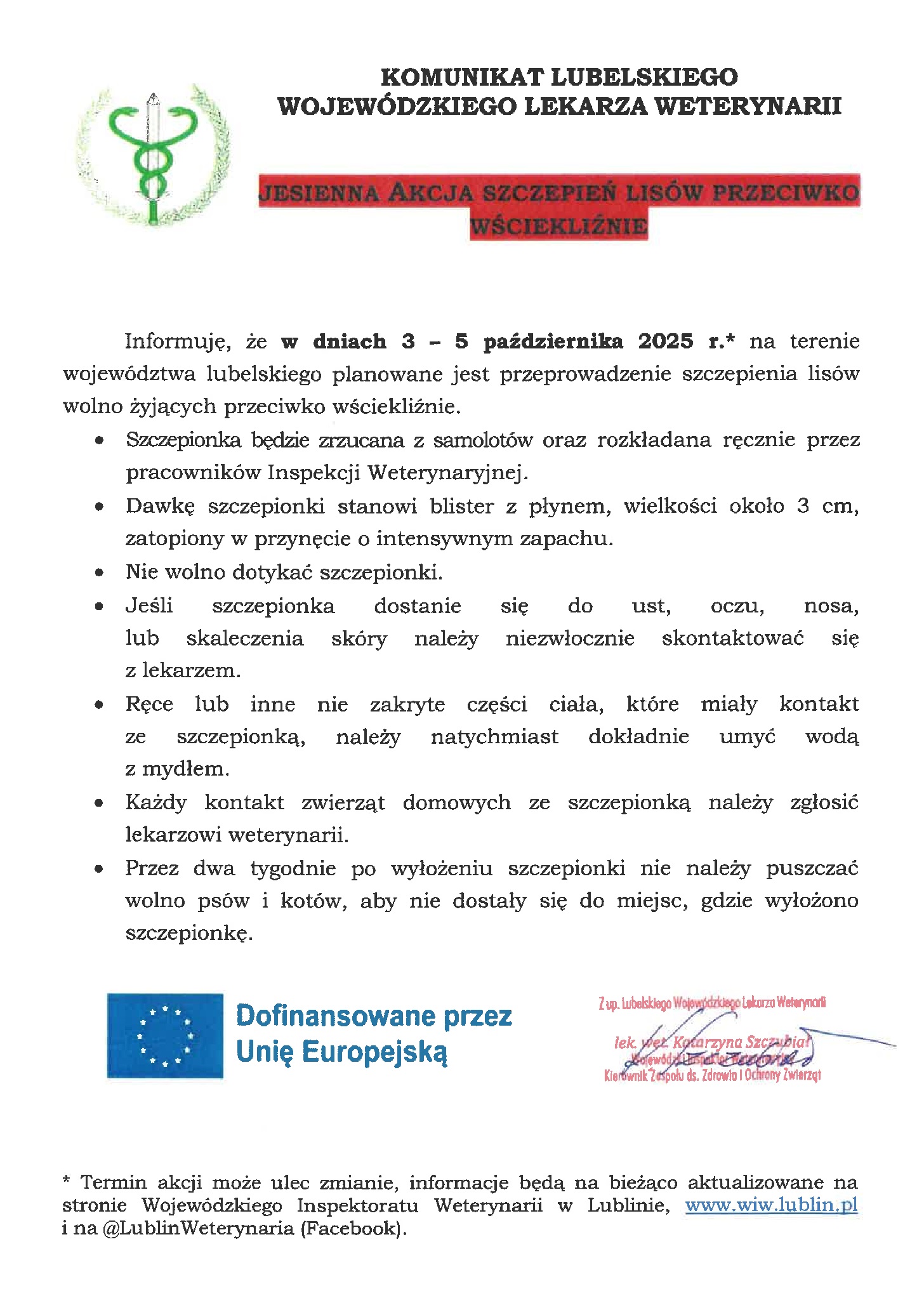 SZCZEPIENIE LISÓW PRZECIWKO WŚCIEKLIŹNIE 3-5.10.2025 R.Redakcja2025-09-25Aktualności Drukuj🖨 Poprzedni Wpis Adoptuj psiaka! Zostań nowym właścicielem! Następny Wpis Radecznica na mapie Rajdu Klasykiem po Roztoczu!